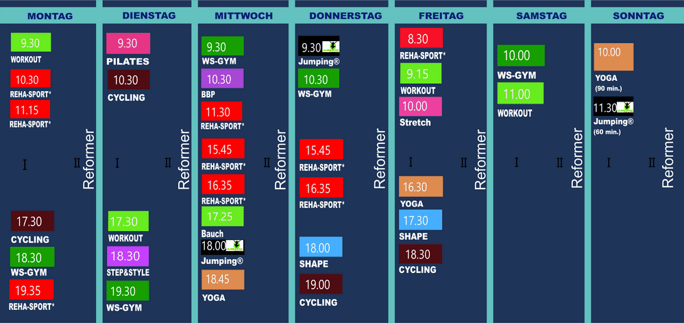 Reformer Pilates, Yoga, Pilates, Wirbelsäulengymnastik, Cycling, Shape, Step, Jumping, Body-Workout, Reha-Sport, BBP und vieles mehr -
